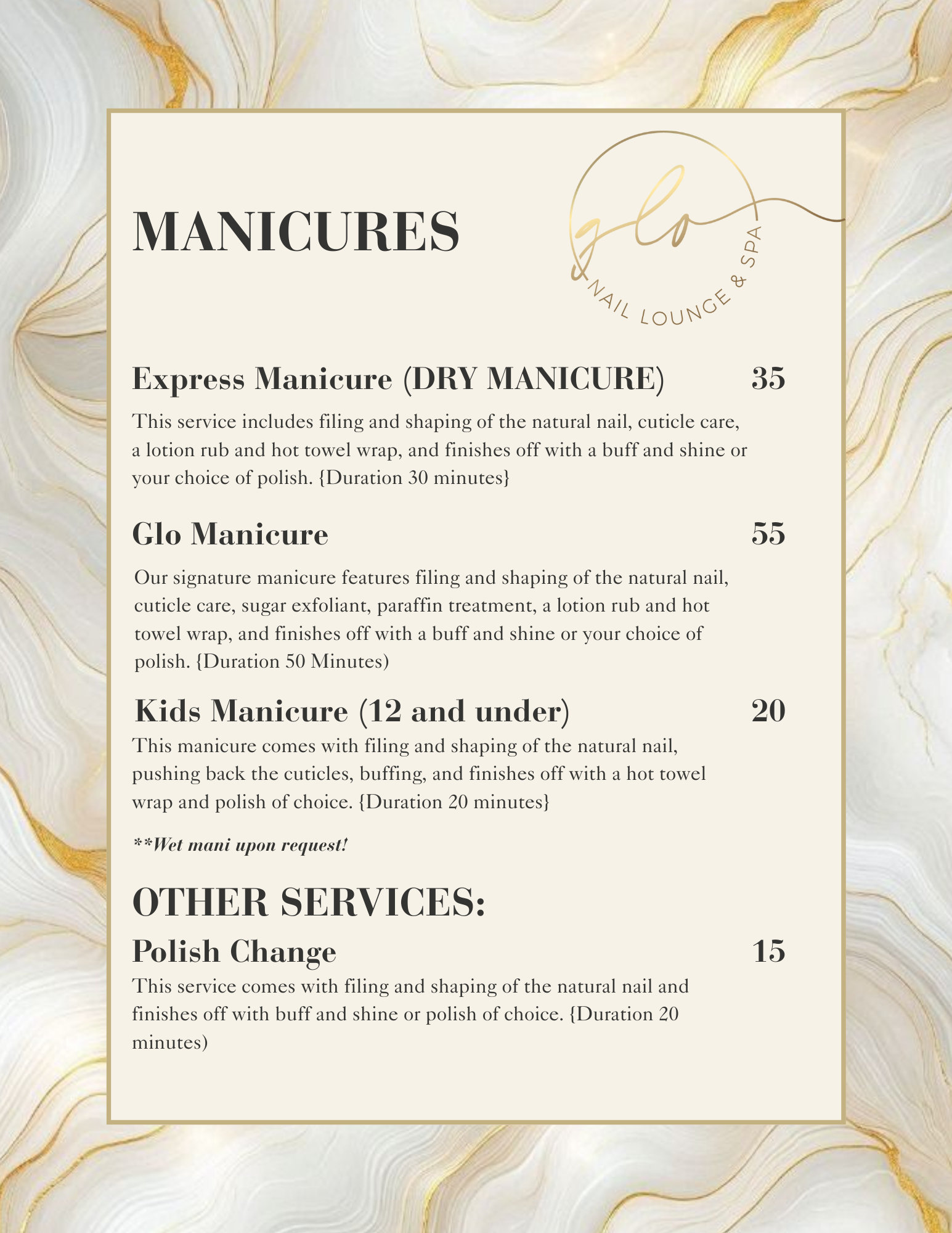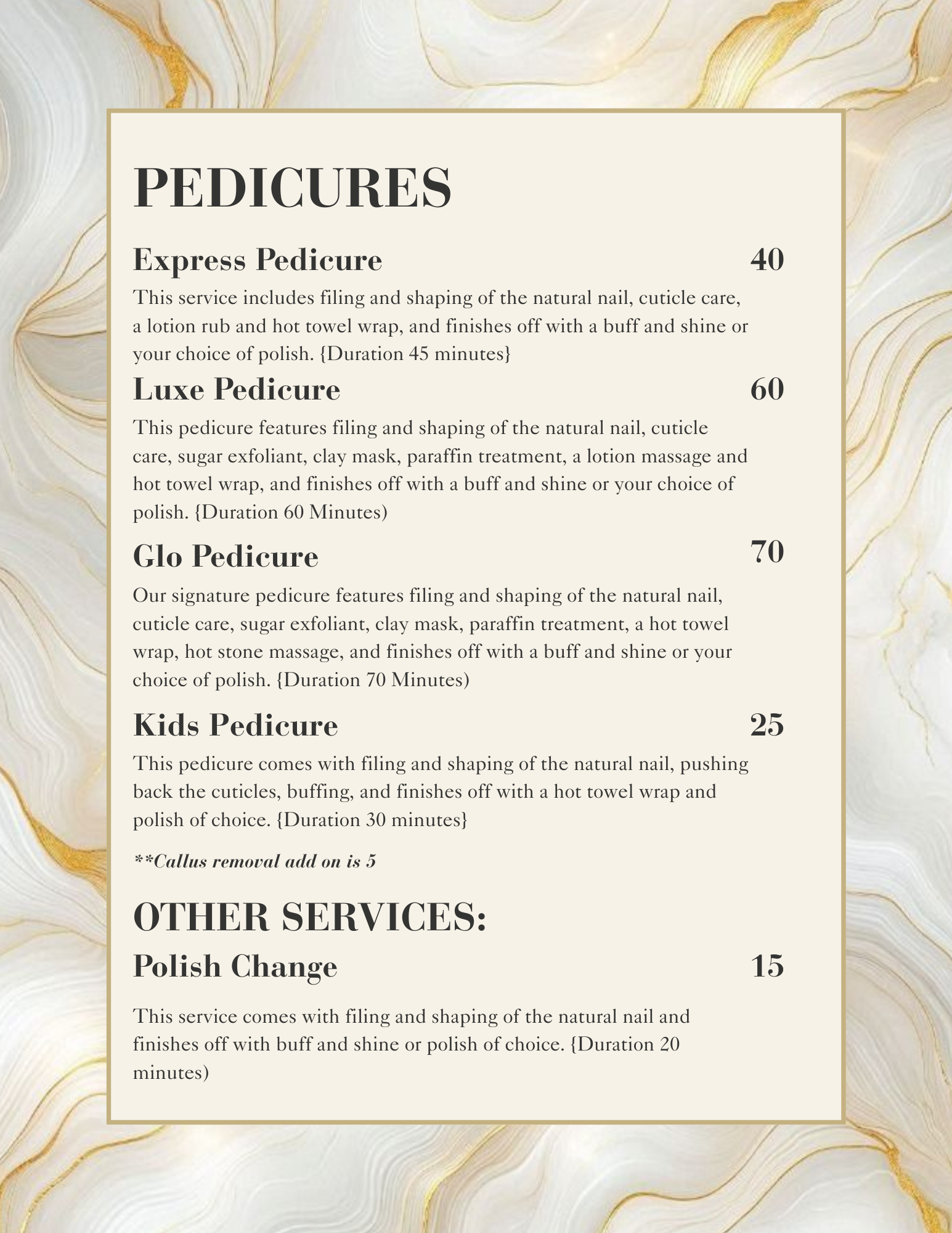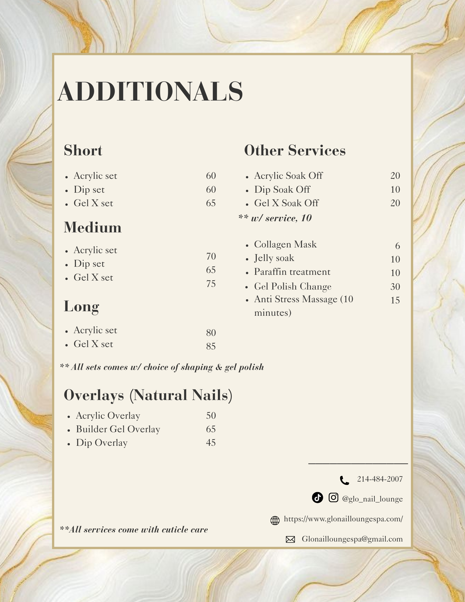 Looking for additional services alongside our Manis and Pedis? Your nail's preferences will be satisfied by our various sets and additional amenities, curating a luxurious procedure throughout.